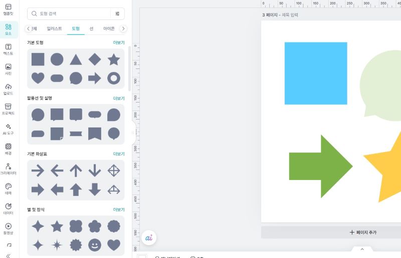 기본 사각형, 원, 삼각형부터 말풍선, 화살표, 별 등 실용적인 요소들이 많이 있어요.